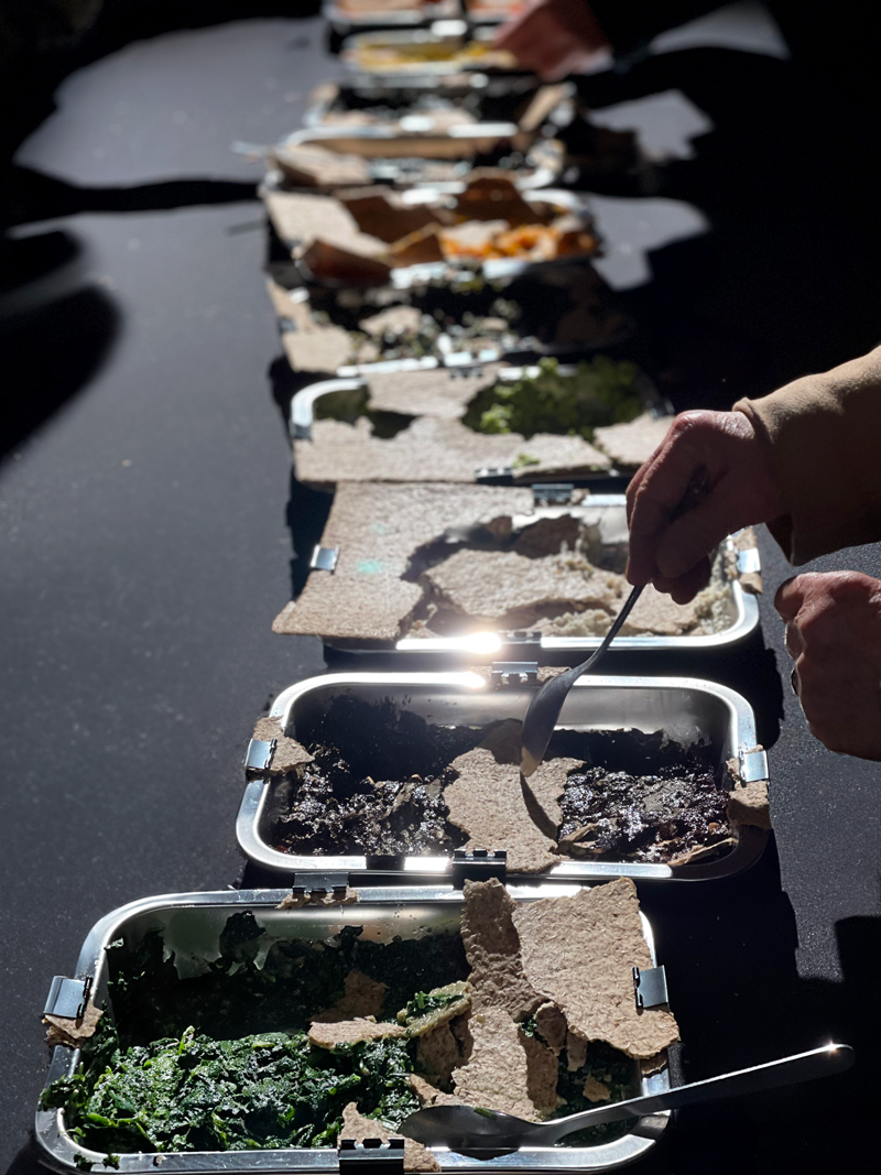 Onze plats, disposés sur table, sont recouverts de grands biscuits de drêche réalisés avec la biscuiterie creusoise Cocasse et Loquace. Ces surfaces dissimulent les préparations.