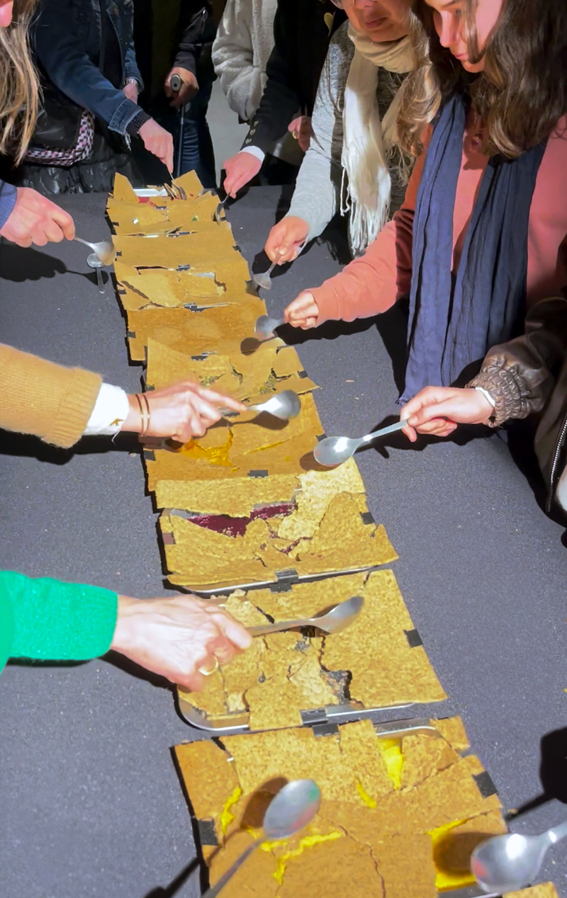 Le public est invité à les casser à l’aide de grandes cuillères pour accéder à ce qui se trouve en dessous.