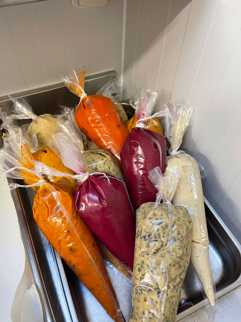 Des choux pâtissiers, réalisés par le boulanger d’Ernée, ont été garnis de différentes préparations alimentaires et saupoudrés de poudres de légumes ou d’épices.