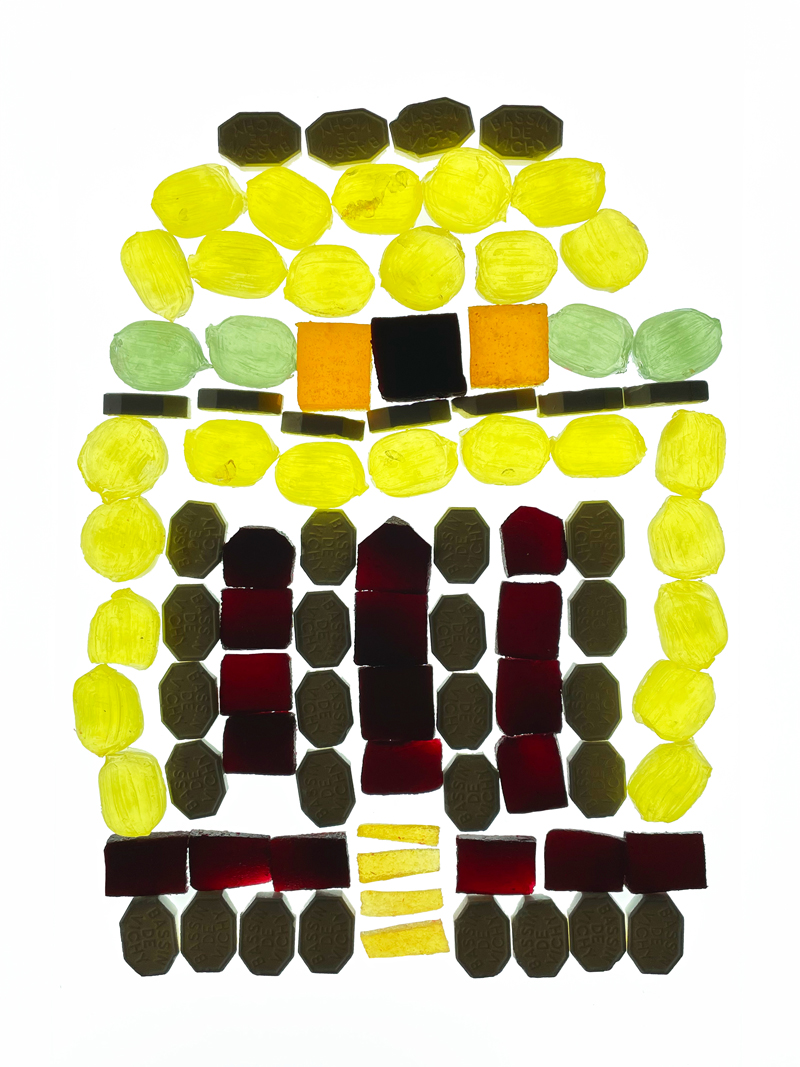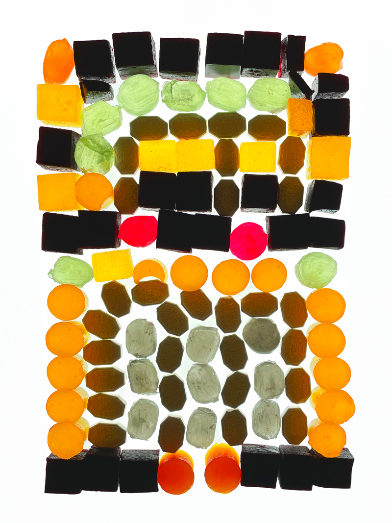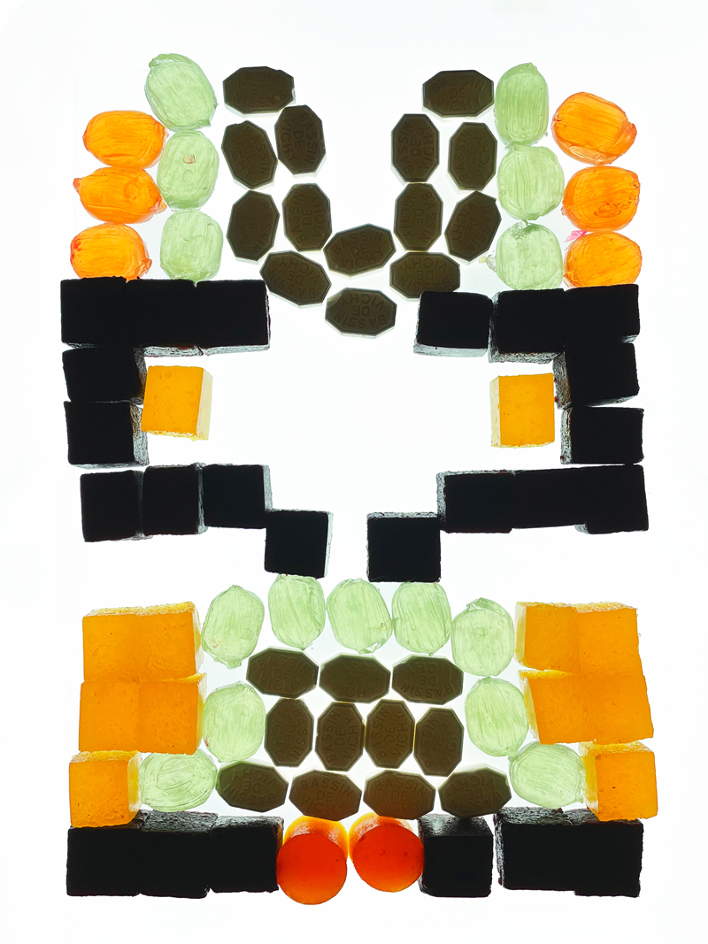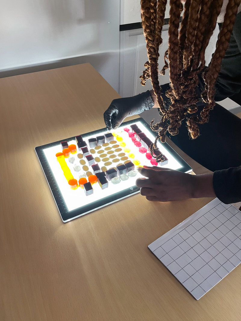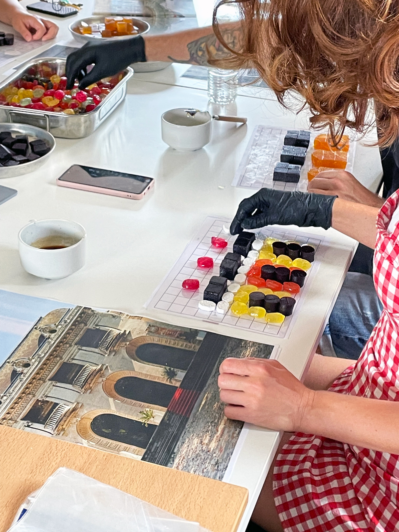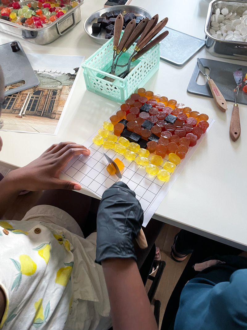 Dans un second temps, ces observations ont été traduites dans le cadre d’un atelier de design culinaire. À partir d’un dispositif commun — une grille rétroéclairée au format A4 — les participant·es ont été invité·es à interpréter visuellement les façades observées. Un panel de confiseries et de pâtes de fruits issues du patrimoine local était mis à disposition pour composer des mosaïques comestibles, en travaillant la couleur, la matière et la lumière.