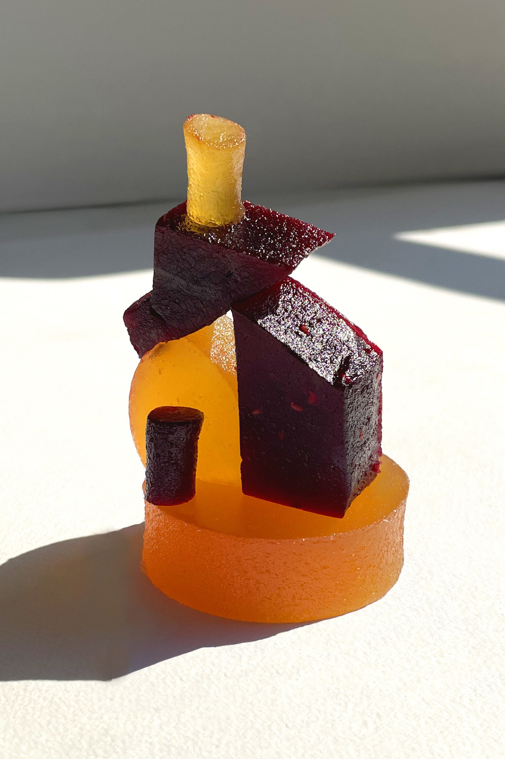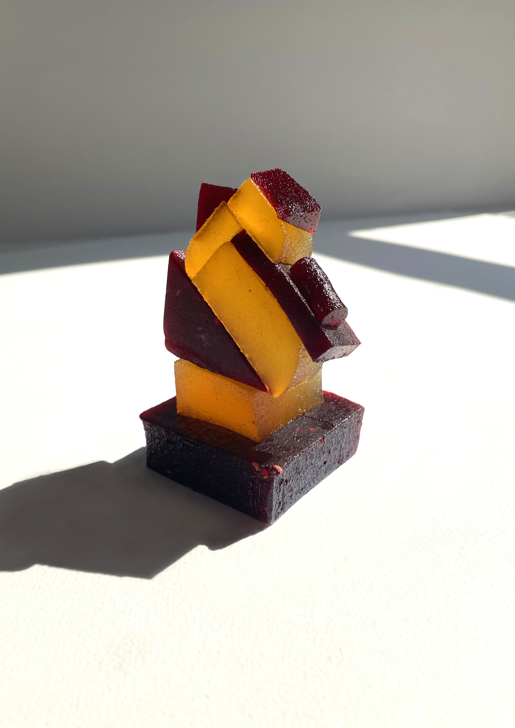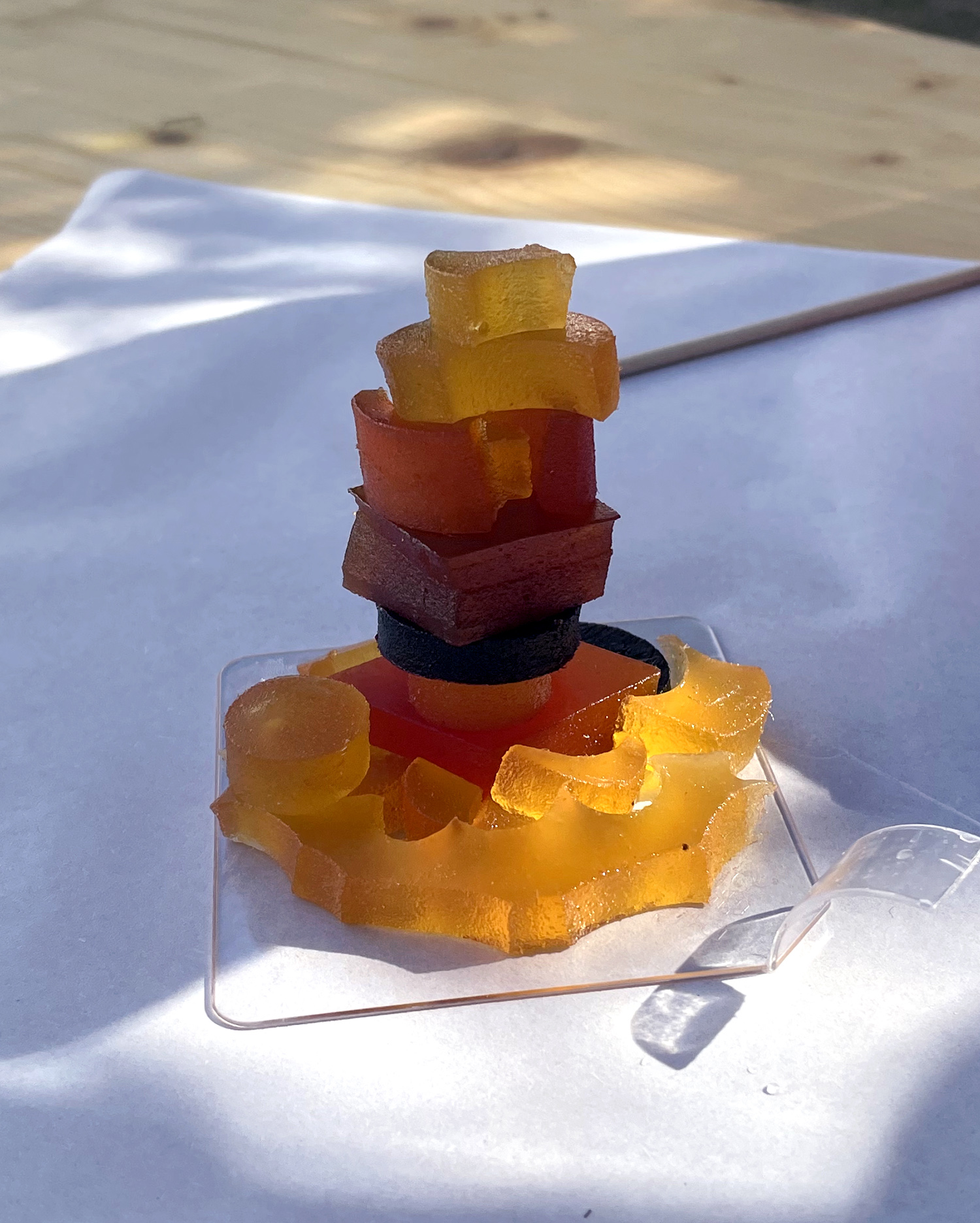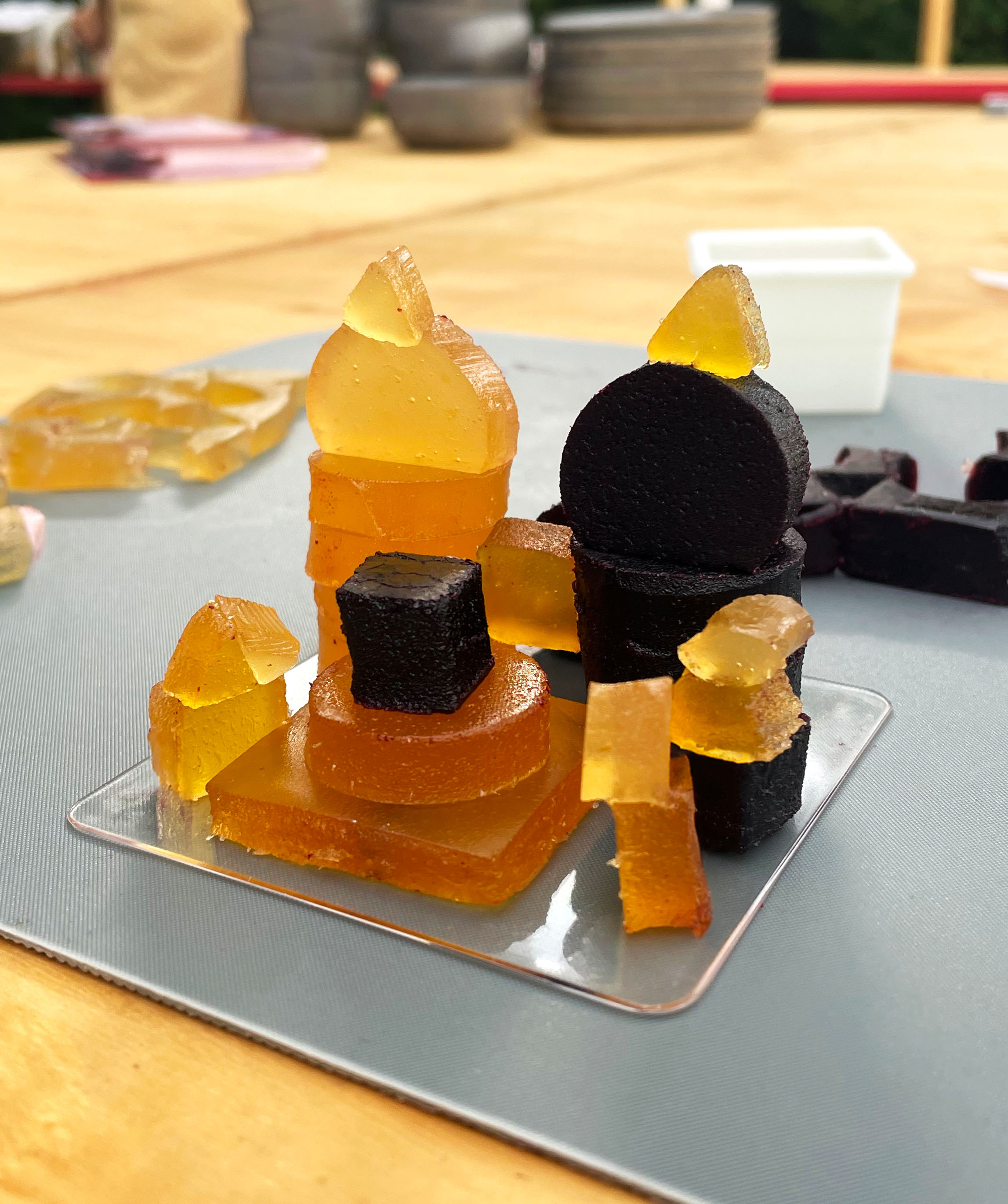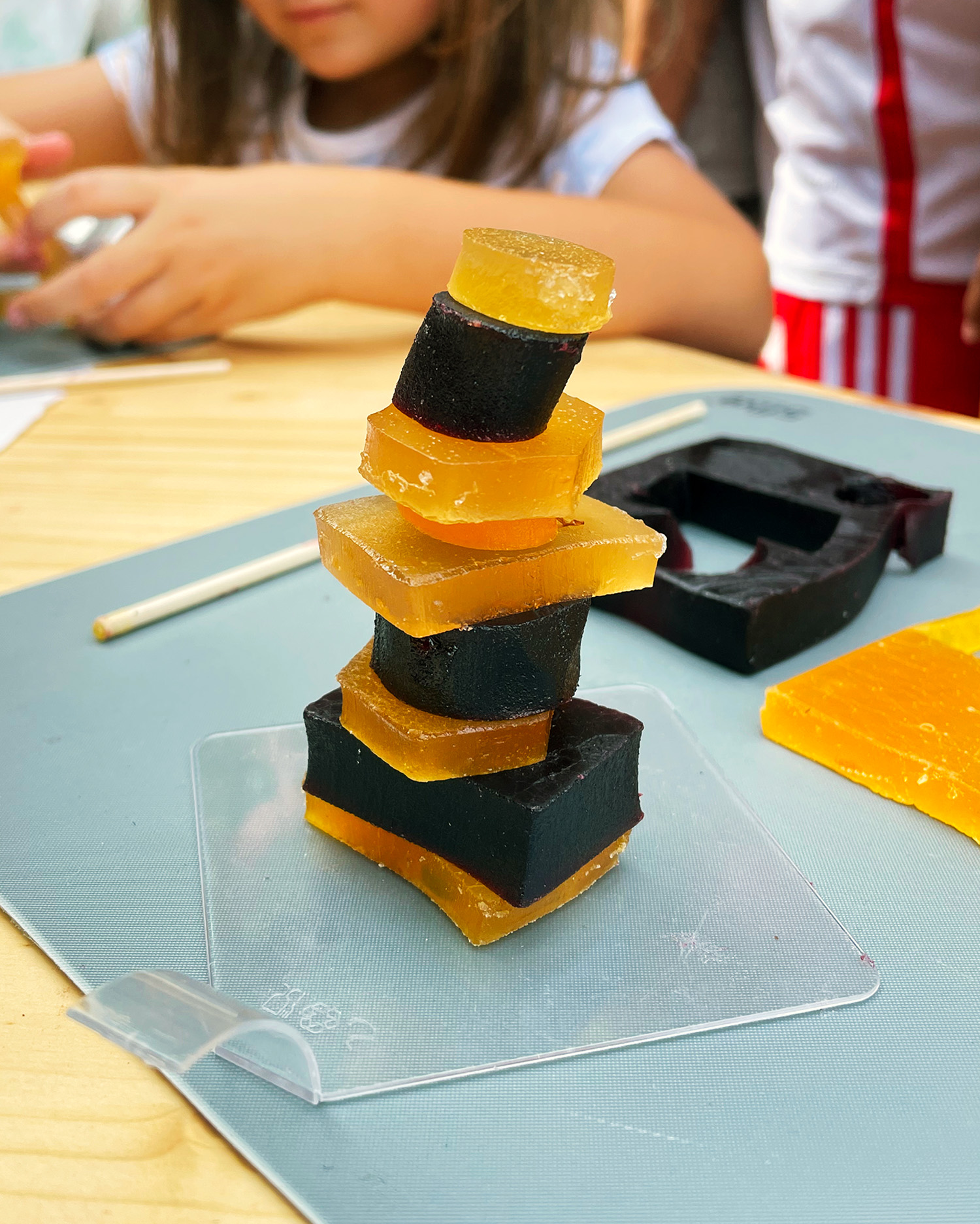 Les pâtes de fruits Cruzilles, issues du patrimoine culinaire local, sont utilisées comme matériau de construction : modules colorés permettant d’aborder formes, équilibres et assemblages.