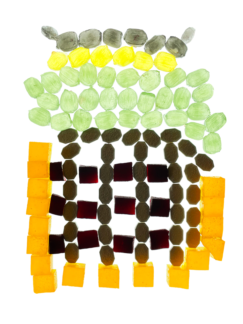 Dans un second temps, ces observations ont été traduites dans le cadre d’un atelier de design culinaire. À partir d’un dispositif commun — une grille rétroéclairée au format A4 — les participant·es ont été invité·es à interpréter visuellement les façades observées. Un panel de confiseries et de pâtes de fruits issues du patrimoine local était mis à disposition pour composer des mosaïques comestibles, en travaillant la couleur, la matière et la lumière.