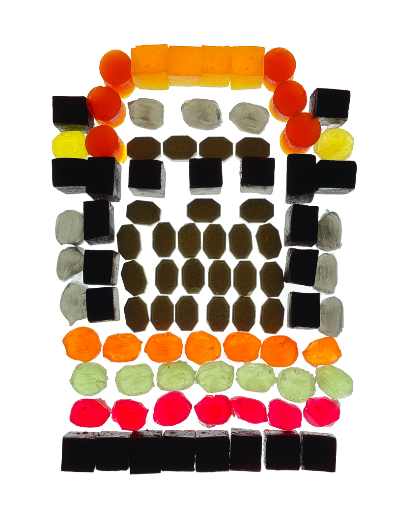 Les compositions, conçues comme des façades translucides évoquant le vitrail, ont été rétroéclairées puis photographiées dans le cadre d’une exposition, avant d’être dégustées.